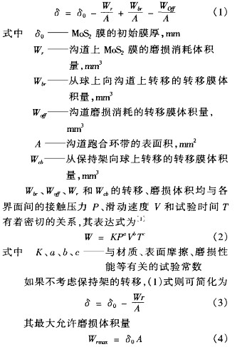式中滑動(dòng)速度V的計(jì)算可綜合考慮自旋滑動(dòng)速度和差動(dòng)滑動(dòng)速度。固體潤(rùn)滑軸承要獲得長(zhǎng)壽命,在設(shè)計(jì)時(shí)應(yīng)控制各滑動(dòng)速度,減小接觸應(yīng)力,在成膜時(shí)厚度應(yīng)大一些。